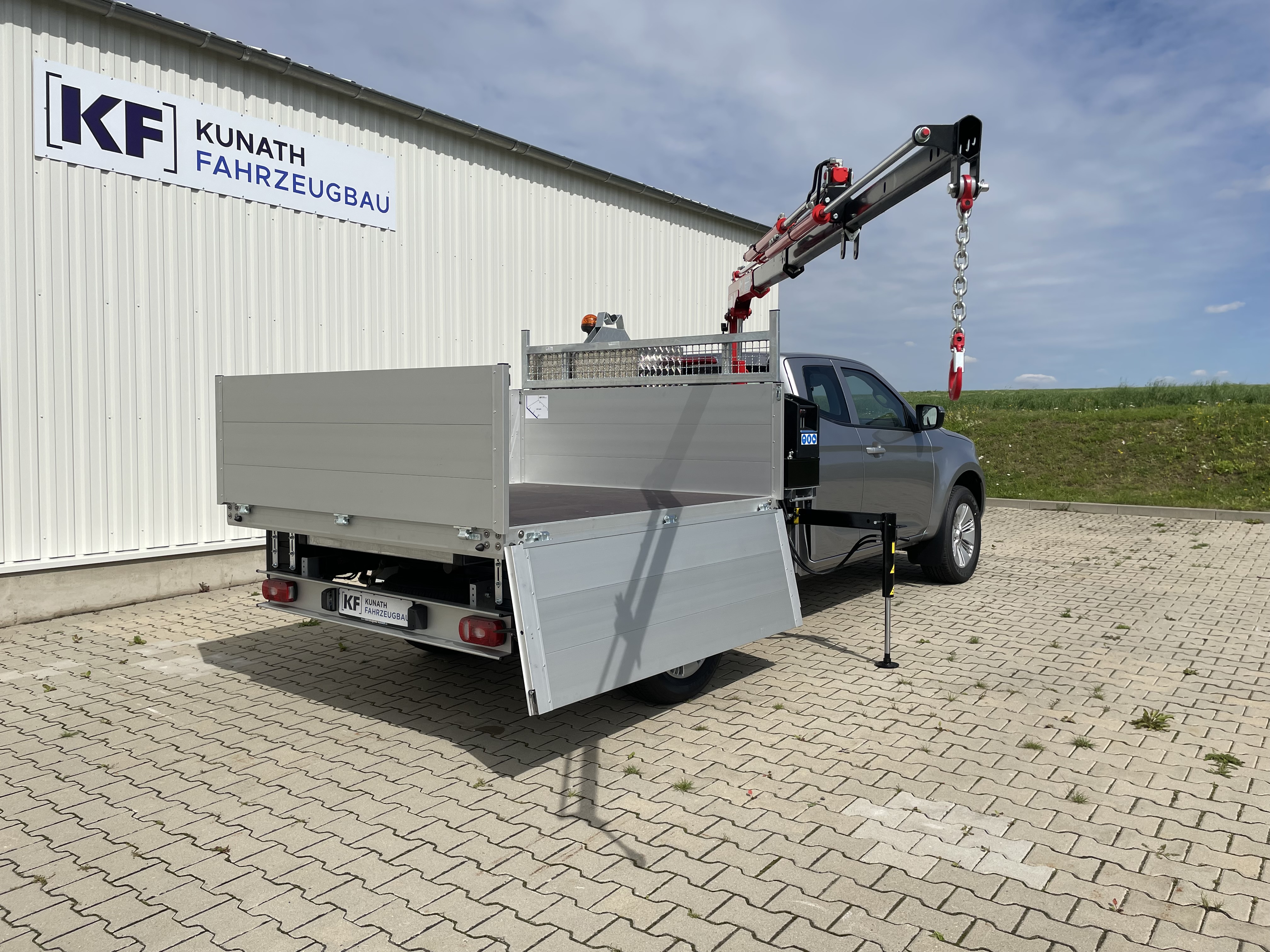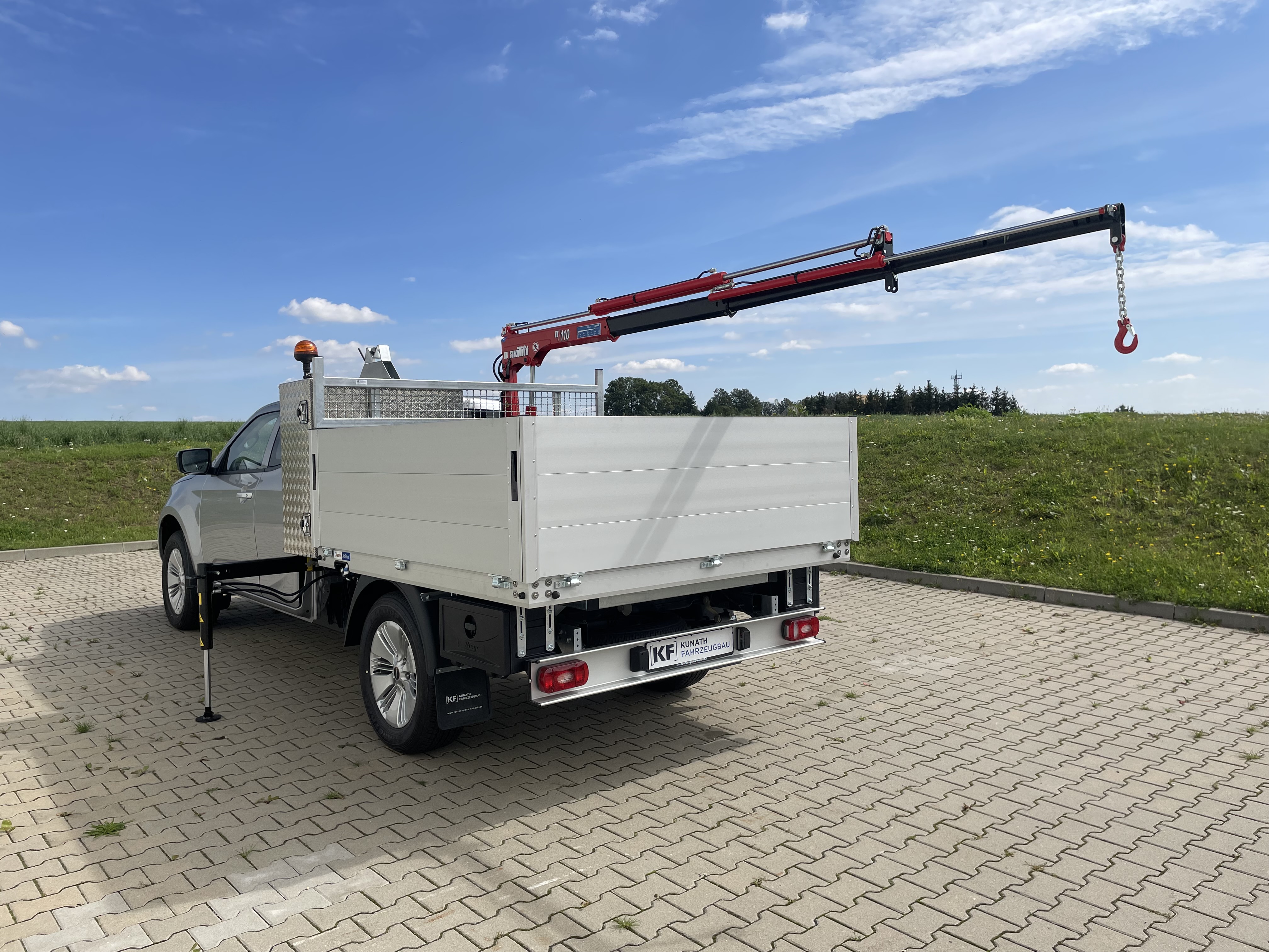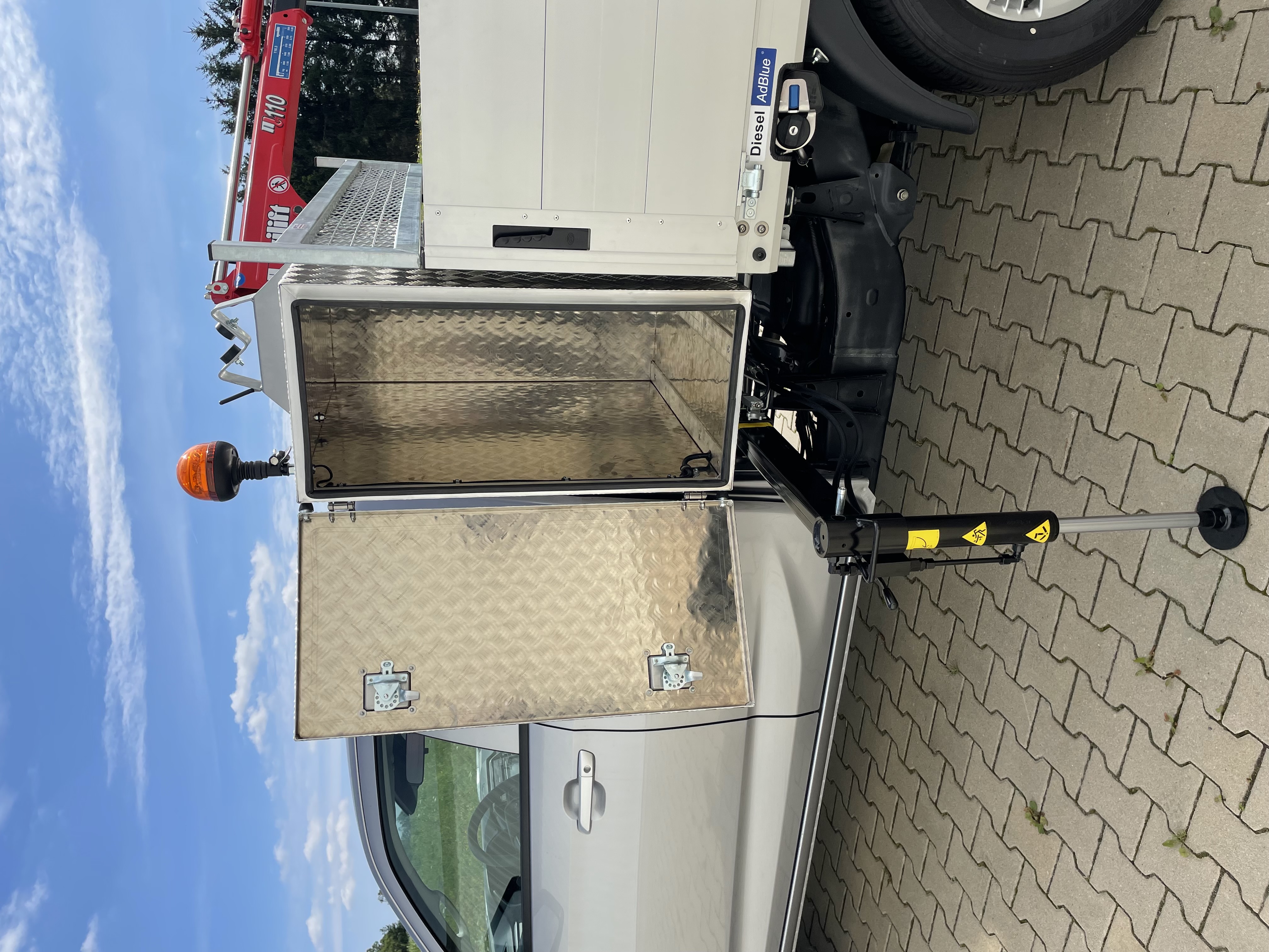 In diesem Falle befindet sich hinter dem Fahrerhaus der Maxlift 110S.3 Ladekran. Das Auf- und Entladen von schwerem Material wird somit wesentlich erleichtert. Die großzügige Alupritsche bemisst eine Innenbreite von 1.900 mm und eine Länge von 2.000 mm. Die Bordwandhöhe beträgt 600 mm, umlaufend. Die Bordwände sind abklappbar. Der sogenannte Leiterträger beläuft sich bei diesem Fahrzeug bis zum Fahrerhausdach.