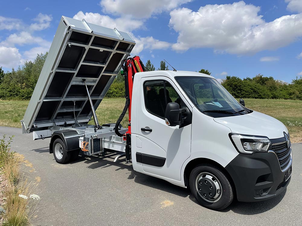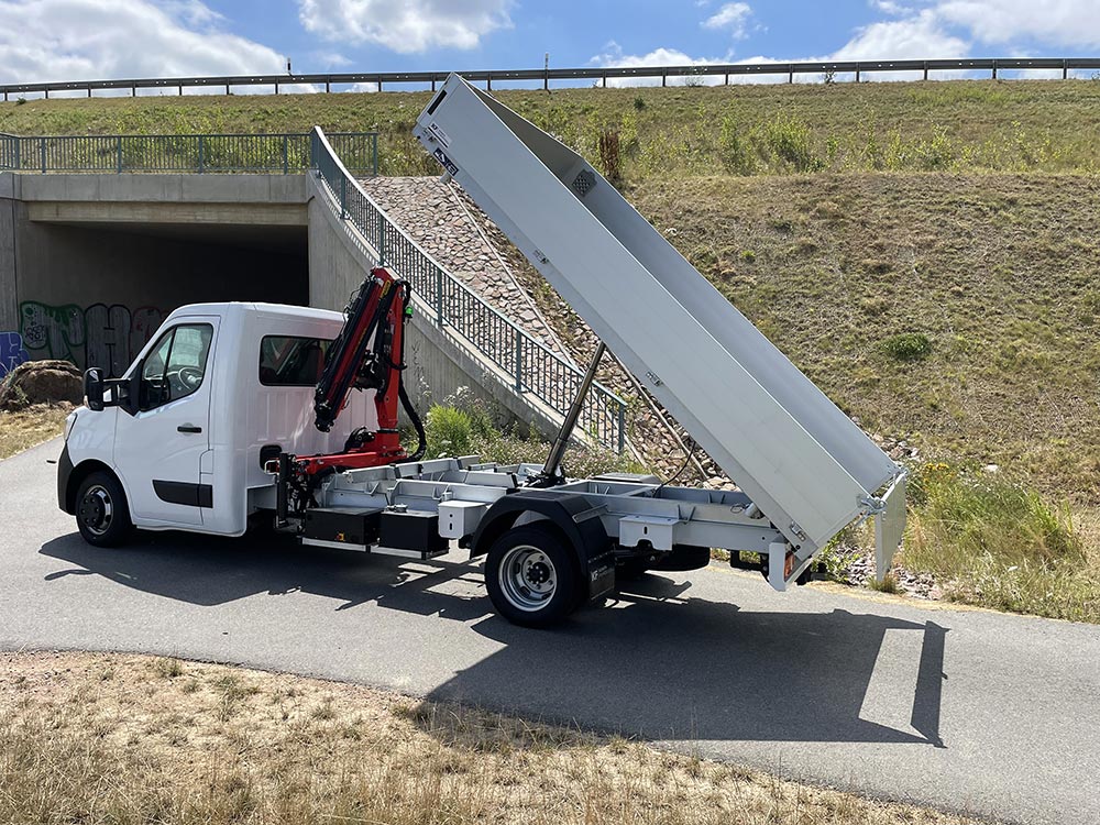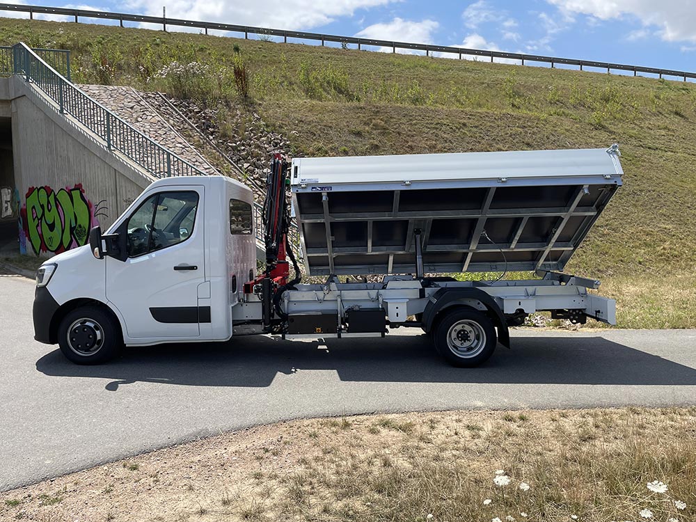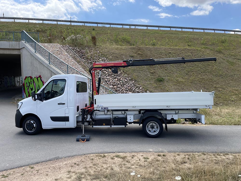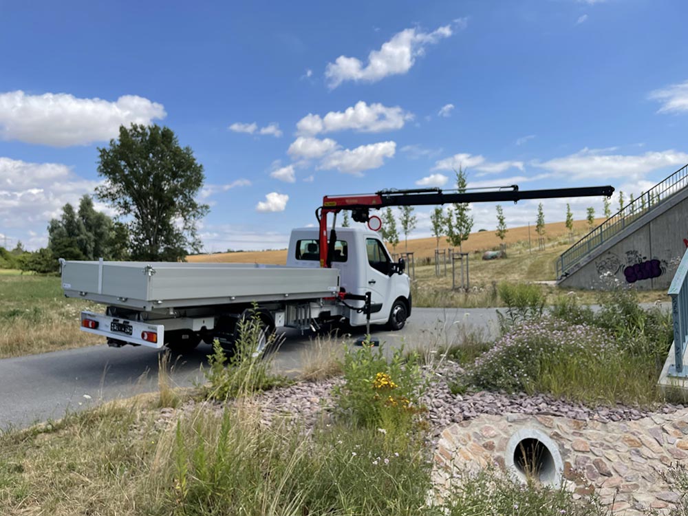 Die Pflege und Instandhaltung der Netzanlage im Wasser- und Abwasserverbund ist mit den unterschiedlichsten Aufgaben verbunden. Das Durchführen kleiner Baumaßnahmen, Landschaftspflege sowie die Wartung und Instandsetzung von Anlagen und Gebäuden stellt verschiedene Anforderungen an Mensch und Maschine. Für das richtige Arbeitsmittel hat sich ein Versorger mit Kran/Kipper Aufbau auf einem Renault Master mit 4,5t zGG entschieden.